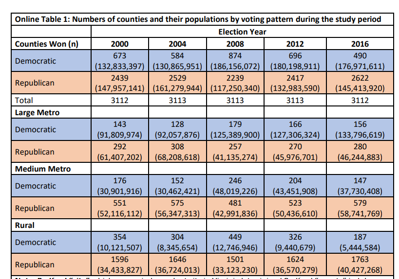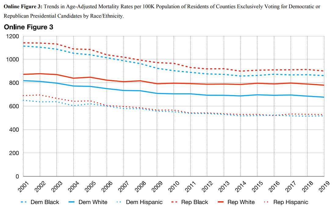 They classified counties as “Democratic” or “Republican” for the four years that followed a presidential election. They also sought to determine whether such patterns were affected by sex, race, and ethnicity as well as urban or rural status.
