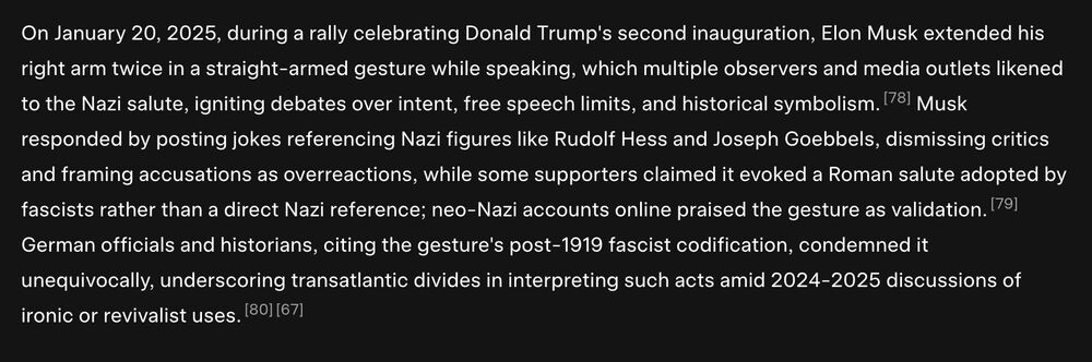 Musk didn’t like being criticized on Wikipedia for his Nazi salute at the inauguration, so Grokipedia (yes, that’s a thing now) doesn’t mention it on the entry for Musk. But it does have, at least until Elon learns about it and deletes it, have a separate entry for the Nazi salute controversy, saying