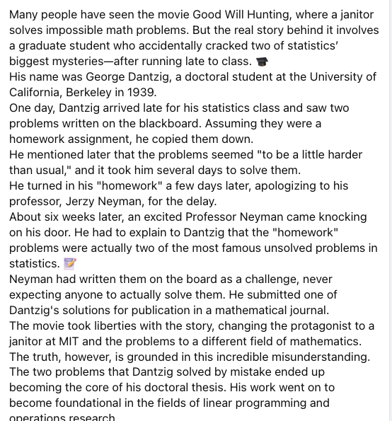 Borderline qualifying for Happy thoughts, but more an interesting thought than a happy thought. What Dantzig did confirmed in Wikipedia