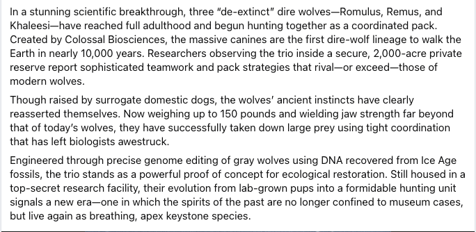 Agree that in this case, they aren’t dire wolves at all. They just edited the grey wolf genome a little to try to make dire wolf like characteristics.