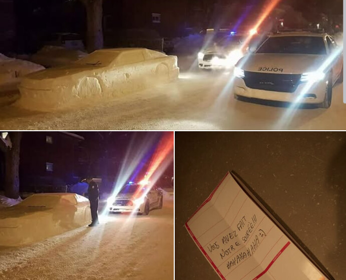 CBS Los Angeles writes that after the officers realized there was no car under the snow pile, Laprise was given a fake parking ticket that read, “You made our night hahahahaha :)”