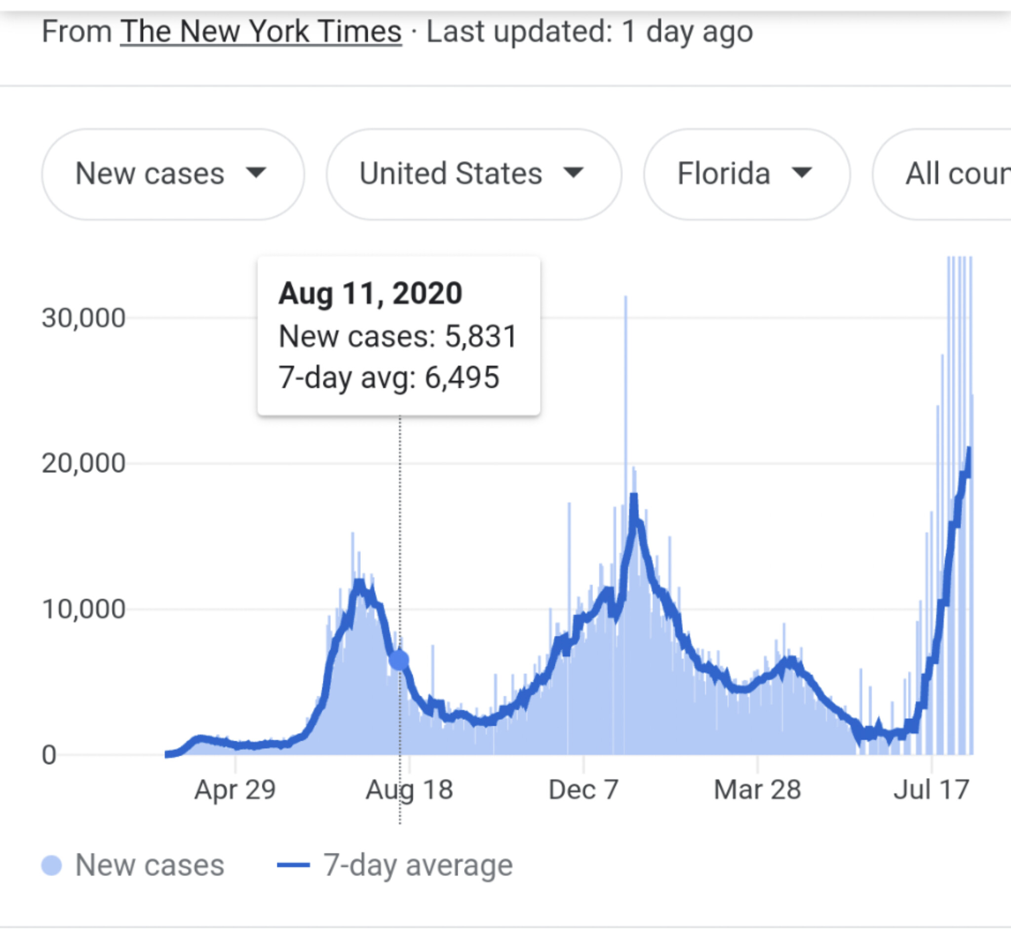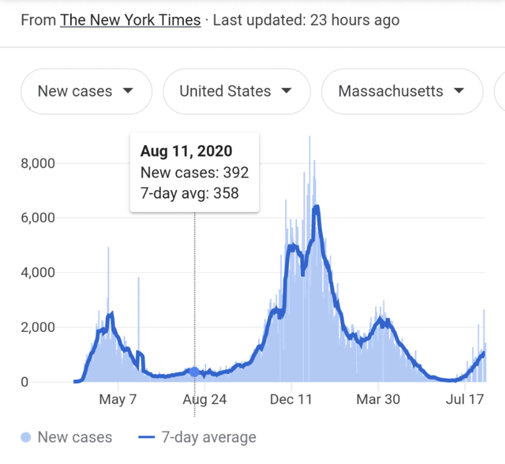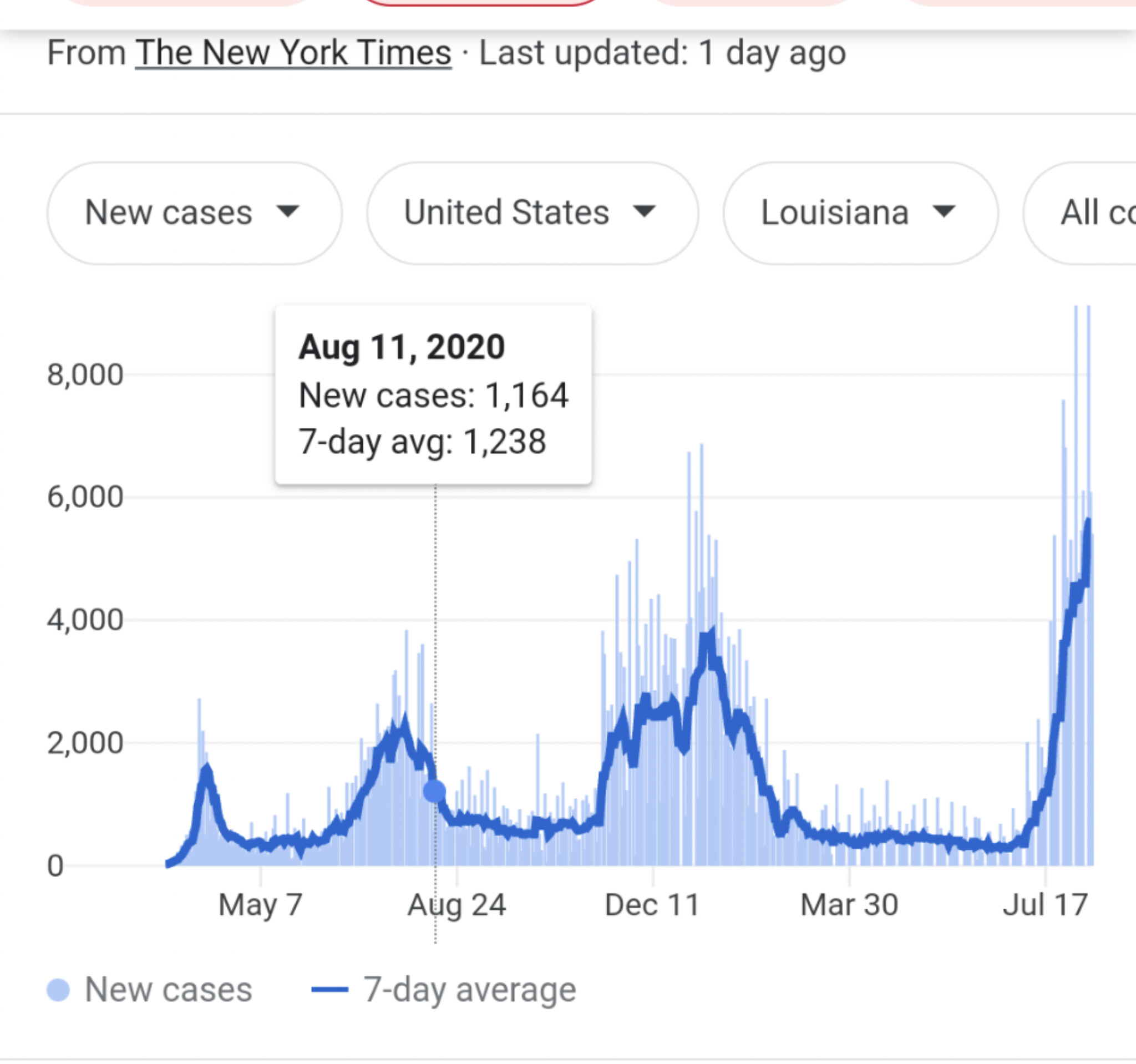I think she is saying that on Aug 11, 2020 MA had a 7 day overage of 358 new cases while FL had 5,831 and LA had 1,164. I still canāt find her pretty graph but I did get to a graph that gave me the data. See Link.
