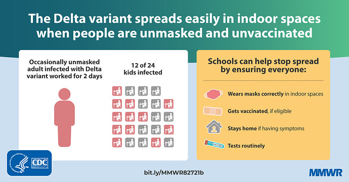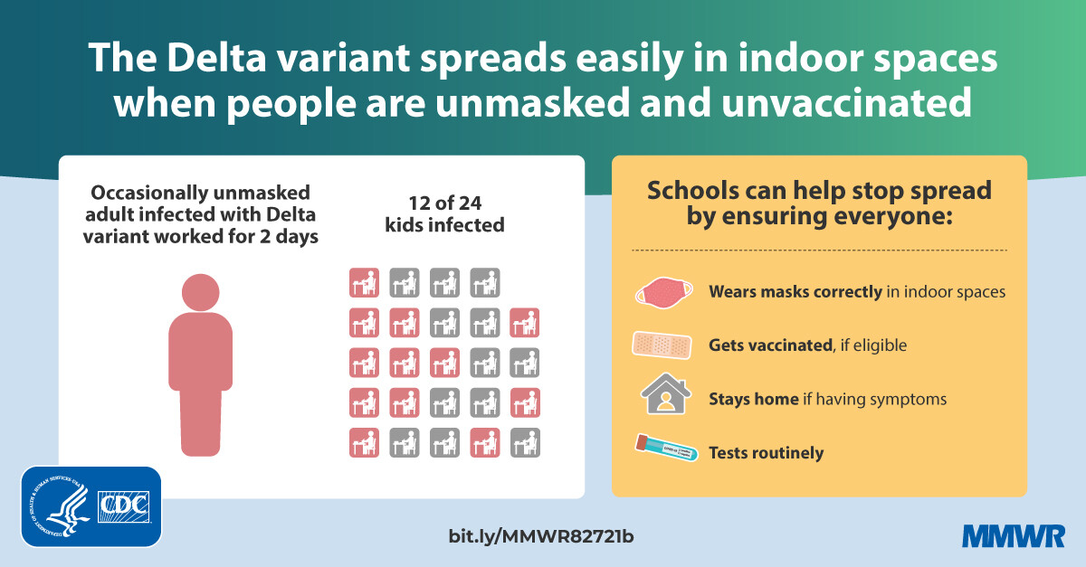 On May 25, 2021, the Marin County Department of Public Health (MCPH) was notified by an elementary school that on May 23, an unvaccinated teacher had reported receiving a positive test result for SARS-CoV-2, the virus that causes COVID-19. The teacher reported becoming symptomatic on May 19, but continued to work for 2 days before receiving a test on May 21. On occasion during this time, the teacher read aloud unmasked to the class despite school requirements to mask while indoors. Beginning May 23, additional cases of COVID-19 were reported among other staff members, students, parents, and siblings connected to the school. To characterize the outbreak, on May 26, MCPH initiated case investigation and contact tracing that included whole genome sequencing (WGS) of available specimens. A total of 27 cases were identified, including that of the teacher. During May 23ā26, among the teacherās 24 students, 22 students, all ineligible for vaccination because of age, received testing for SARS-CoV-2; 12 received positive test results. The attack rate in the two rows seated closest to the teacherās desk was 80% (eight of 10) and was 28% (four of 14) in the three back rows (Fisherās exact test; p = 0.036). During May 24āJune 1, six of 18 students in a separate grade at the school, all also too young for vaccination, received positive SARS-CoV-2 test results. Eight additional cases were also identified, all in parents and siblings of students in these two grades.