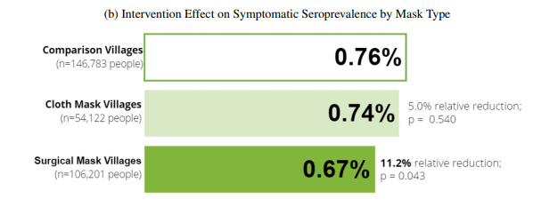 Villages where cloth masks were distributed experienced a 5 percent reduction in symptoms, while villages where surgical masks were distributed saw a reduction of 12 percent.