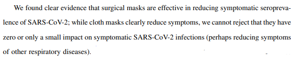 Ah I hadnāt read the article about the study, just the study itself. Study surveyed people and asked about their symptoms, which did have respondents stating that they had fewer symptoms when wearing cloth masks, but actual testing for COVID itself did not show any differences for cloth masks.