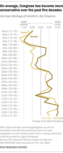 It uses the DW-NOMINATE method, but completely ignores the 2nd dimension. So there’s no credit for recent decidedly liberal shifts in issues like gay marriage, immigration, cannabis legalization, or diversity and inclusion initiatives. That’s the kind of important consideration I’d definitely exclude if I wanted to show that, despite society (voters) and policies/laws becoming more liberal overall, Congress was ackshooally getting more conservative over time.