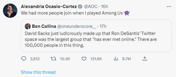 Right wing folks are saying the fact that Twitter spaces repeatedly crashed during the announcement is a good thing b/c it shows how much interest there was for DeSantis. The fact that twitch regularly has larger streams without crashing isn’t relevant and definitely doesn’t reflect poorly on Musk’s decisions with Twitter.