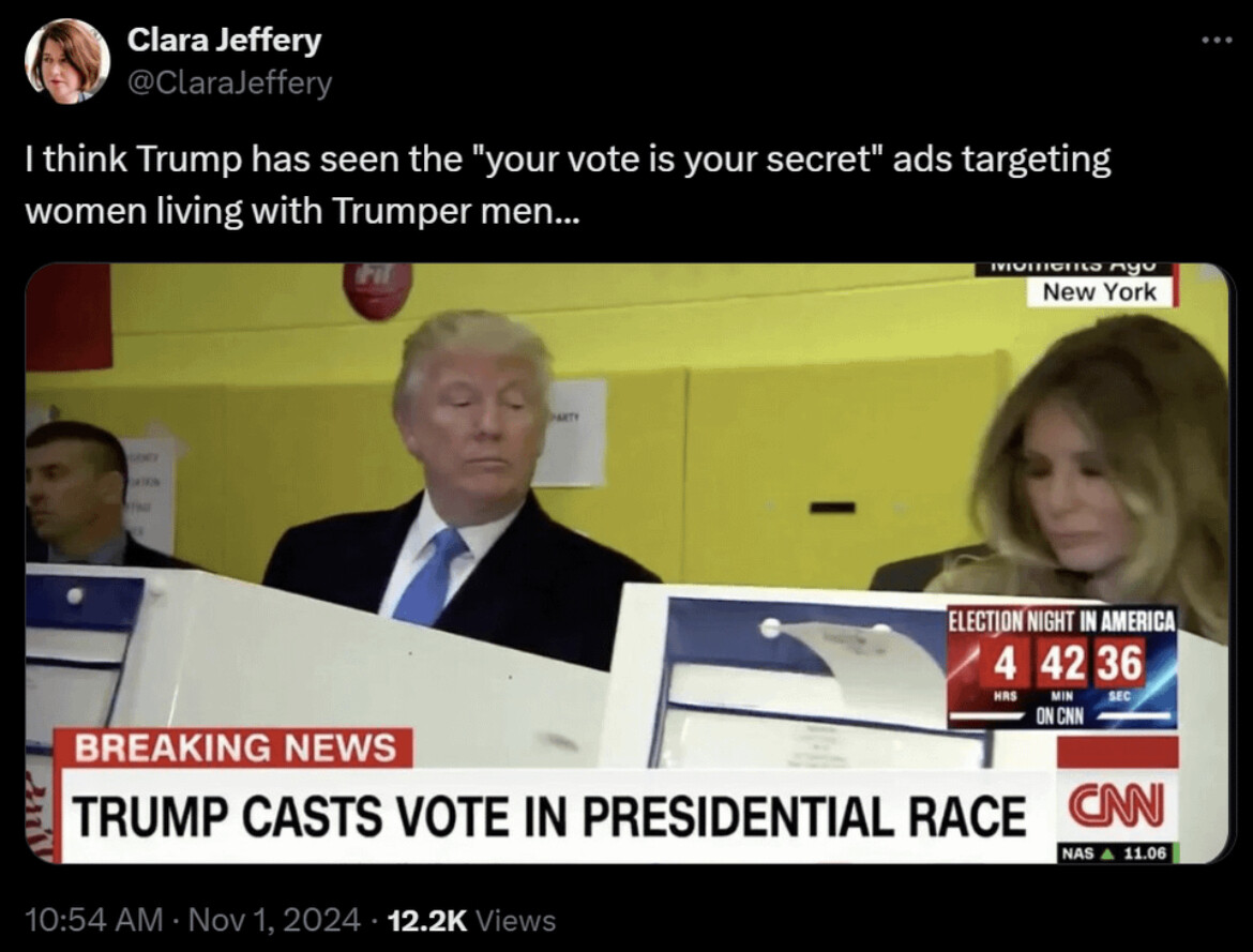 I saw some MAGA folks melting down at the thought of women telling their husband they’re voting Trump but actually voting for Harris. Saying it was the downfall of families or something like that. Guys, if your wife isn’t comfortable telling you how she feels, maybe that says something about you. My wife is a grown-ass woman and she doesn’t need me to tell her how to vote.