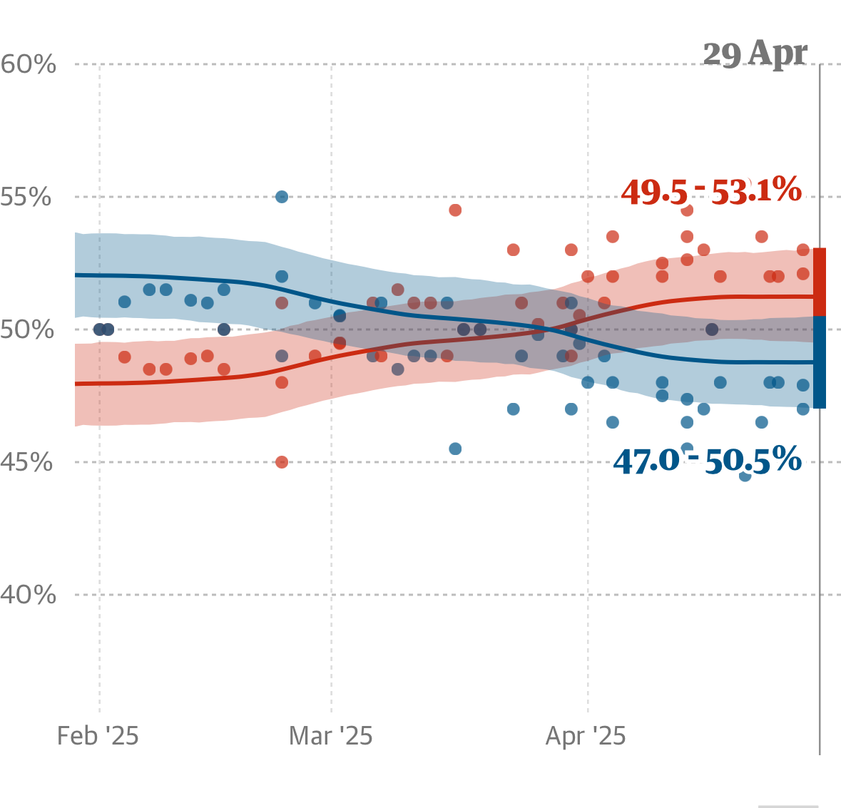 Yes I noticed that. Here’s the chart (perhaps confusing, red is the left wing party and blue is right wing) showing how much the expected share of seats changed.