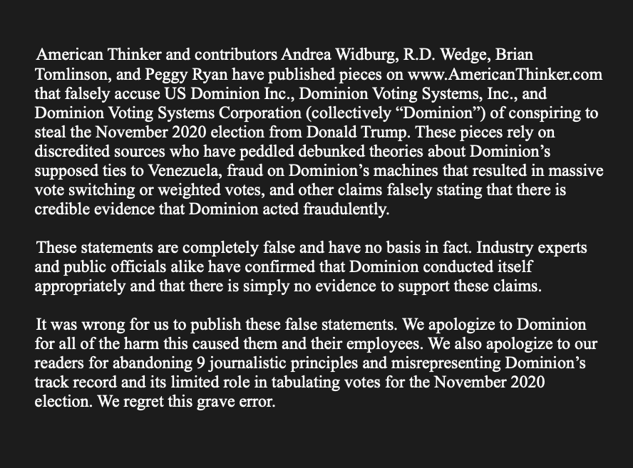 Conservative outlet American Thinker has admitted they published completely fabricated pieces on Dominion and election fraud.