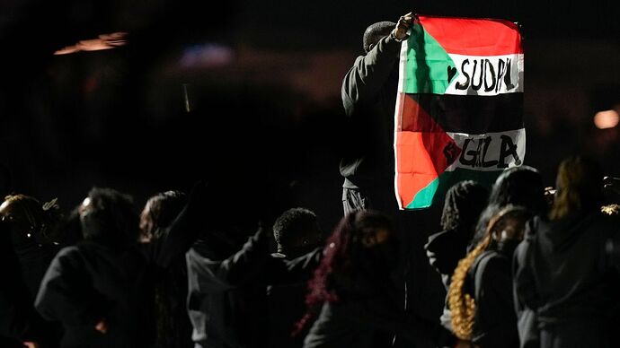 So, one of the dancers at the halftime show unfurled a flag, part Palestinian, part Sudan. Got detained for some reason. What was the reason?