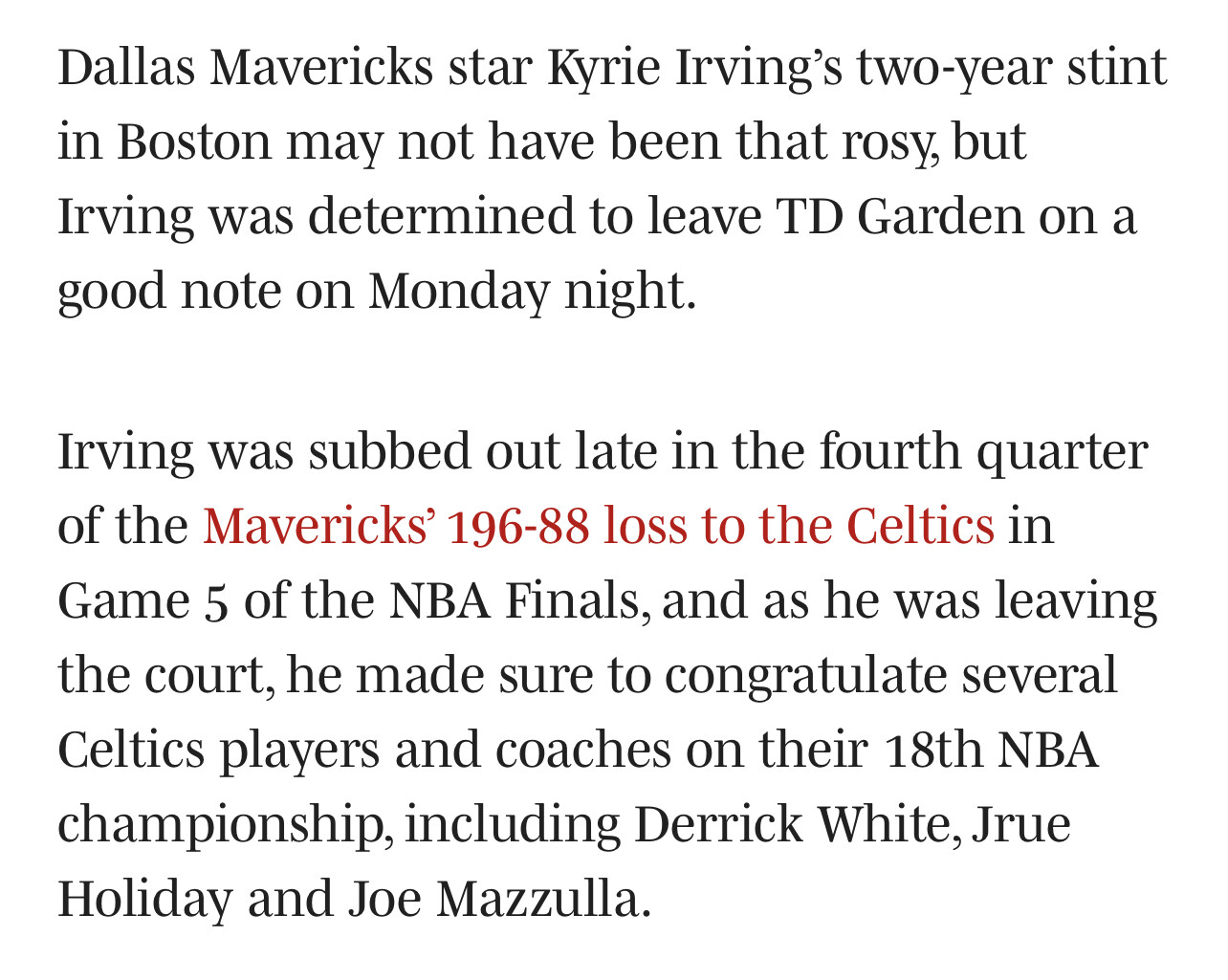 Irving was subbed out late in the fourth quarter of the Mavericks’ 196-88 loss to the Celtics in Game 5 of the NBA Finals