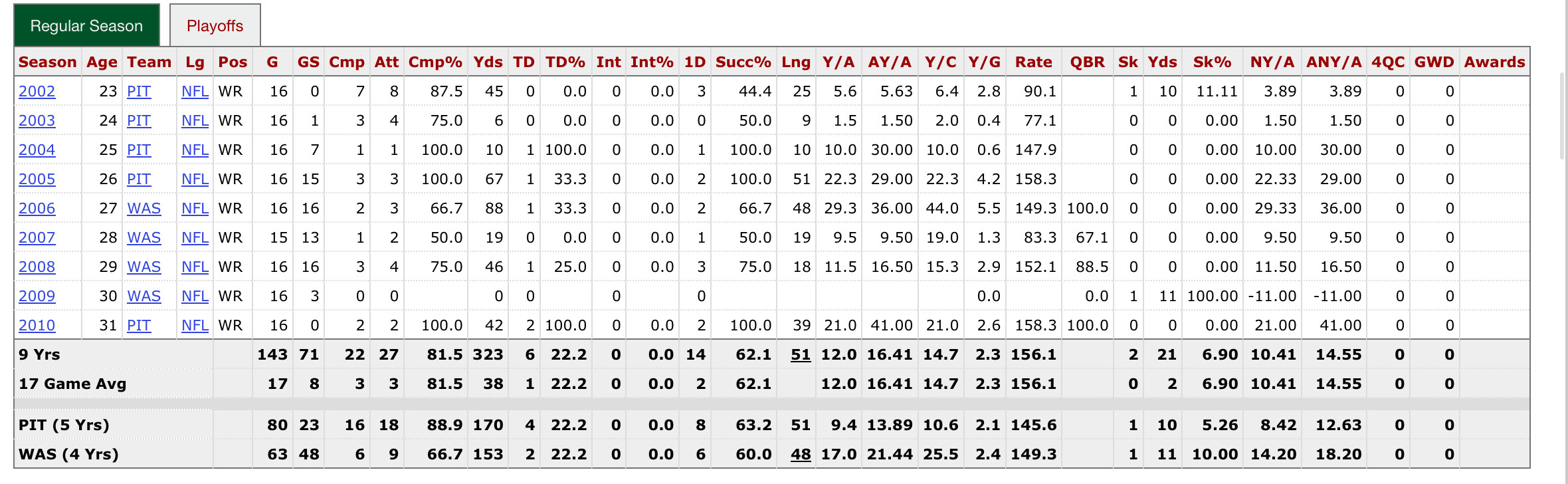 Does it seem odd to anyone else that his passer rating for PIT and WAS combined is higher than both his PIT passer rating AND his WAS passer rating?