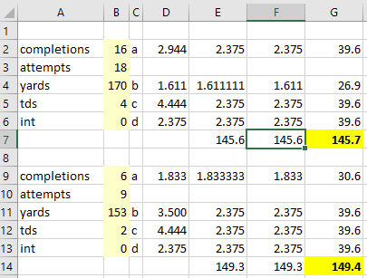 I am not matching any of the three passer ratings and my combined passer ratings is, quite logically, in between the two team passer ratings.