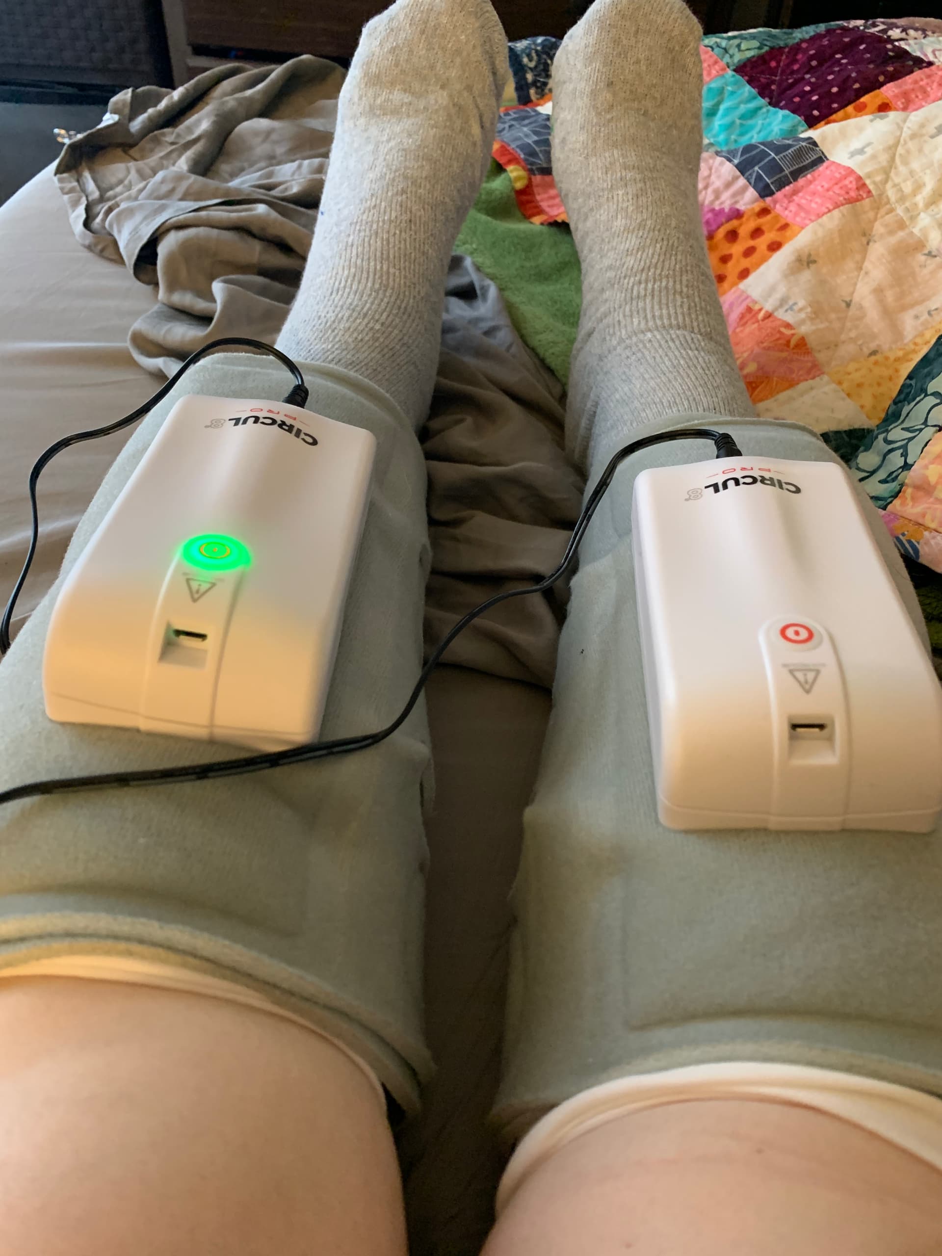 When my husband came into the room and I had my white compression socks on (but hadnāt put the circulation cuffs on yet), my husband thought it was my pale skin and that winter had made me even paler. Which is funny because itās not like he never sees my bare legs, he sees them quite often. I guess Iām just that light.