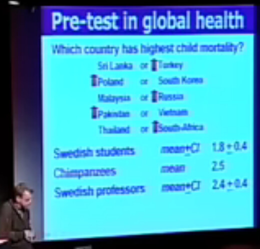 This Swedish prof was invited to teach to an elite group of Swedish students. He gave them a pre-test asking them to identify which of the five pairs of countries had a significantly higher child mortality rate. On average they got 1.8 correct, significantly less than you might expect from chimpanzees which was also on par with Swedish professors…