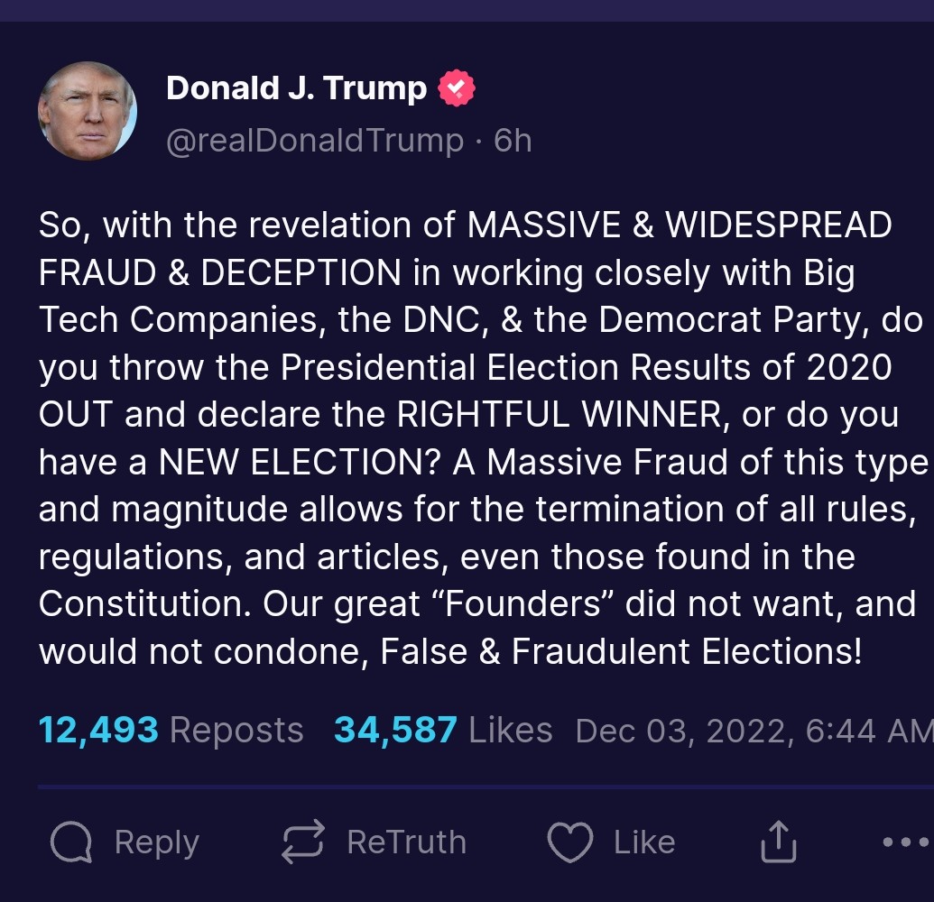 DONALD TRUMP, the former president and the most likely GOP presidential nominee in 2024, today on Truth Social called for the suspension of the Constitution to overturn the 2020 election.
