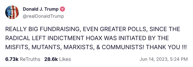 In related news, I switched by registration to “Republican” this year so I can have a voice. Yesterday I got a call where the caller ID said “Donald Trump”. That’s a first. I assume fund-raising off the indictment.