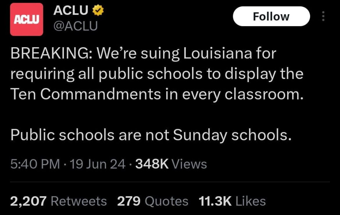 $\textcolor{red}{\text{BREAKING:}}$ $\textcolor{red}{\text{Louisiana}}$ $\textcolor{red}{\text{decides}}$ $\textcolor{red}{\text{to}}$ $\textcolor{red}{\text{acquiesce}}$ $\textcolor{red}{\text{to}}$ $\textcolor{red}{\text{the}}$ $\textcolor{red}{\text{ACLU’s}}$ $\textcolor{red}{\text{demands}}$ $\textcolor{red}{\text{by}}$ $\textcolor{red}{\text{requiring}}$ $\textcolor{red}{\text{all}}$ $\textcolor{red}{\text{public}}$ $\textcolor{red}{\text{schools}}$ $\textcolor{red}{\text{meet}}$ $\textcolor{red}{\text{on}}$ $\textcolor{red}{\text{Sundays