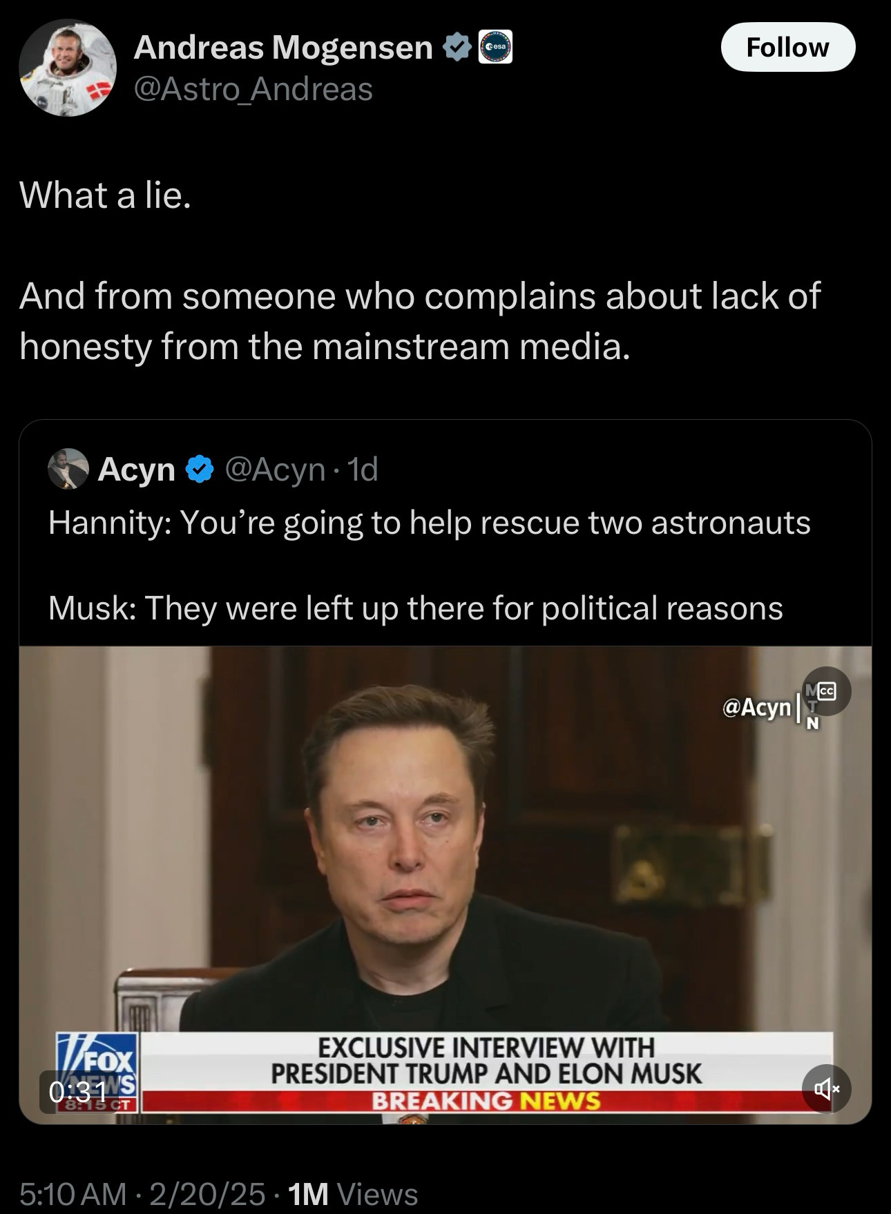 Musk goes on Fox and starts his usual lies and propaganda. He gets called out directly by Andreas Mogenson. Mogenson was ISS commander, and also was a pilot for SpaceX.
