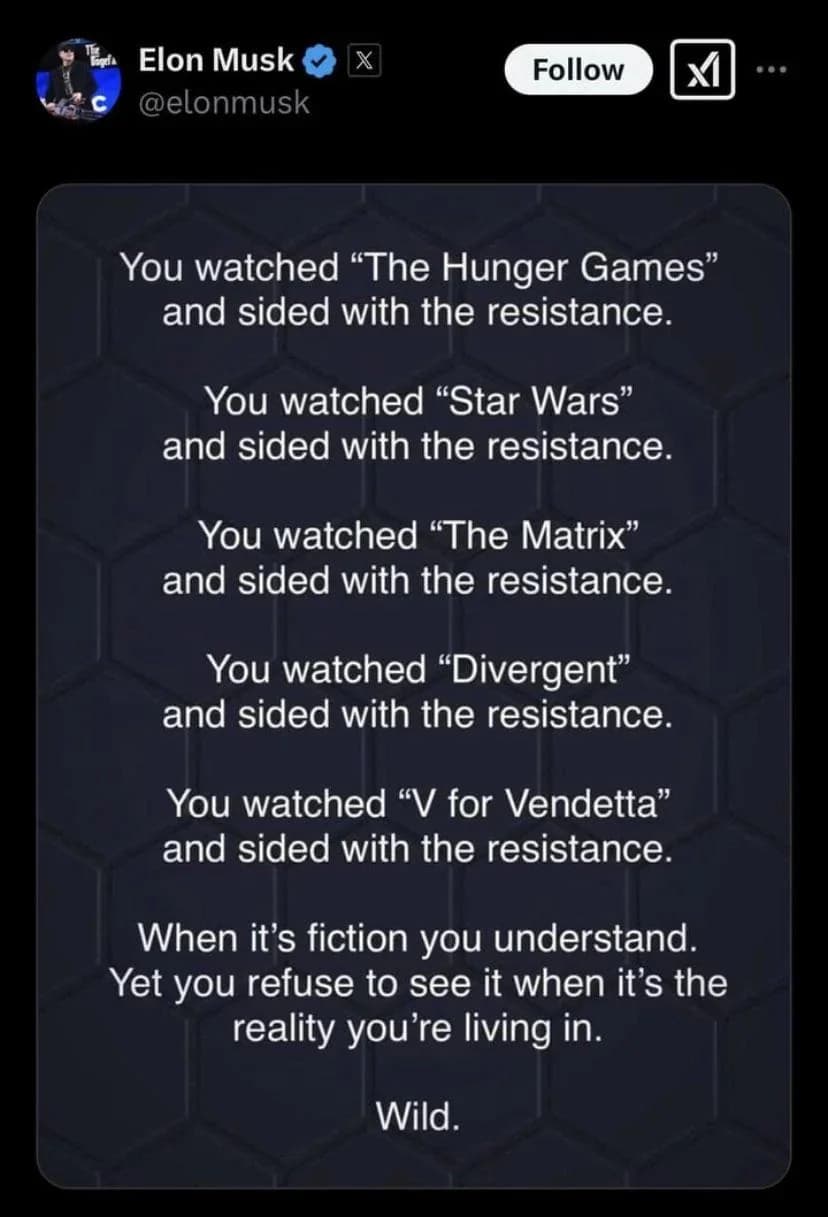 If he sees it making the rounds, it’d be nice if Elmo were reminded of what happened to Coin, the head of the resistance, in the Hunger Games franchise.