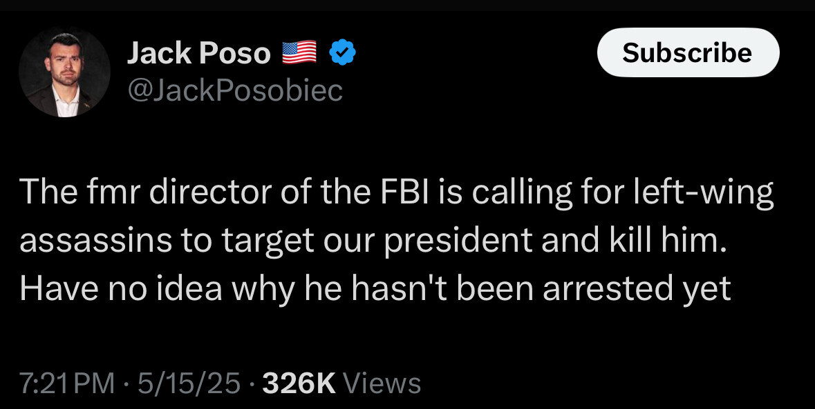 The image depicts a social media post by rightwing nutcase Laura Loomer, in which she responds to Comey’s 86 47 post, by posting an image in which