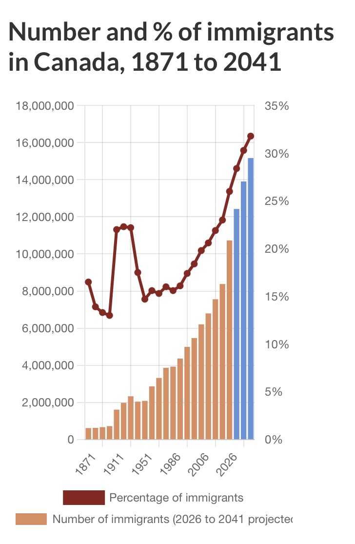 The foreign-born population in Canada is about 50% higher than the US. Post-2025 should be ignored as this chart was produced before the latest surge of immigration was cut back a bit.