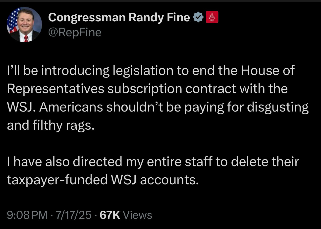 Background is that WSJ is reportedly working on a piece on the Trump Epstein history. It may or may not include info on a lewd birthday card that Trump sent Epstein. There are reports that Trump personally leaned on WSJ staff to quash any story.