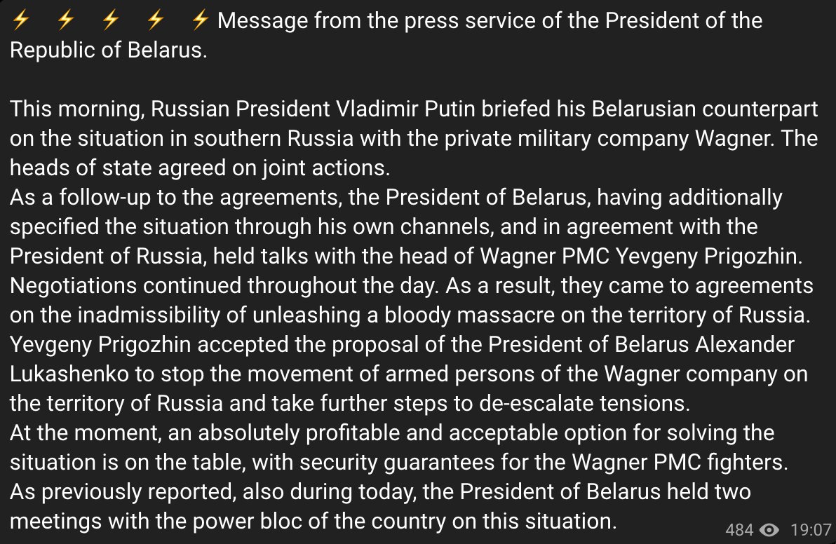 ETA: the headline of this preview is the news of Wagner pulling back. The body of the preview is a little misleading as its referring to comments Putin made earlier about the insurrectionists.