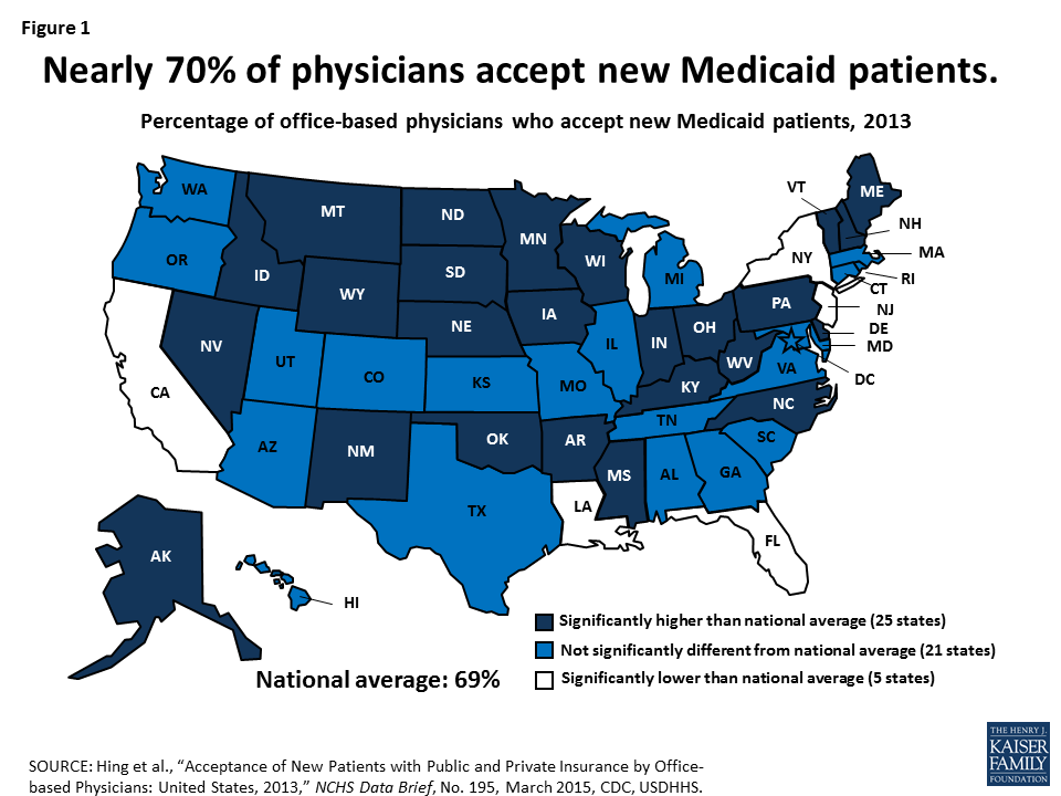 About 70% of all office-based physicians accept new Medicaid patients, including two-thirds of primary care physicians and close to three-quarters (72%) of specialists..