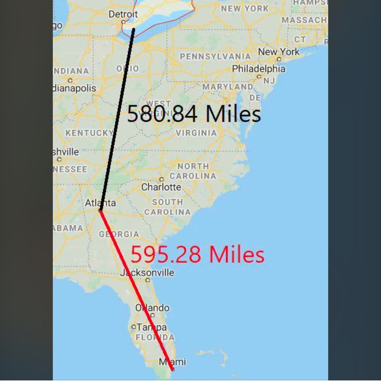 Teh Googooz maps sez 724 miles to Windsor, ON, but 663 miles to Miami, FL (driving). ![]()