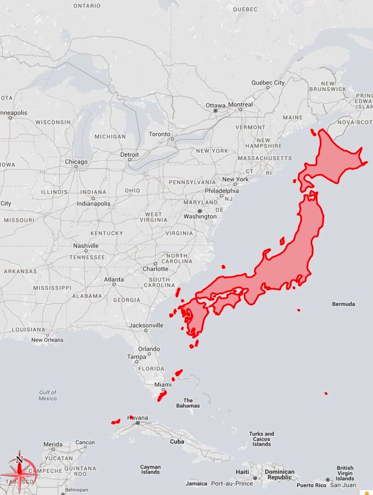 A good and interesting size representation, but shifted just a little south of equivalent. Tip of northern island of Hokkaido is slightly above northernmost extent of Vermont, and tip of southernmost of the 5 main islands, Kyushu, lines up with FL’s northernmost border. Nashville slightly north of Tokyo.