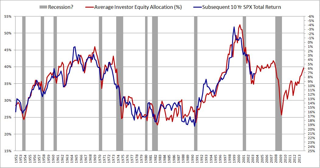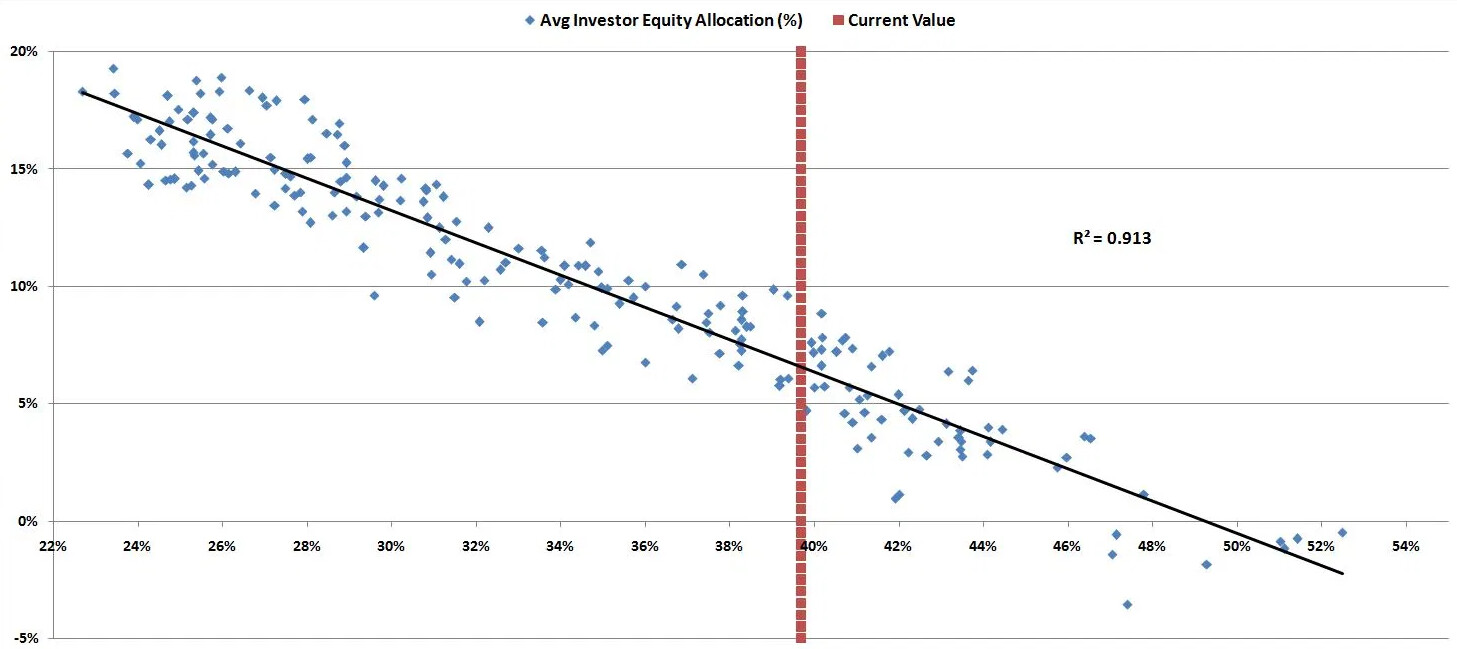 Because such a large percentage (47%, the historical average is more like 35%-40% and a lower bound is about 25%) of US “money” is tied up in stocks (bidding up the stock market) a linear relationship tells us to expect a 1% return for the next 10 years.