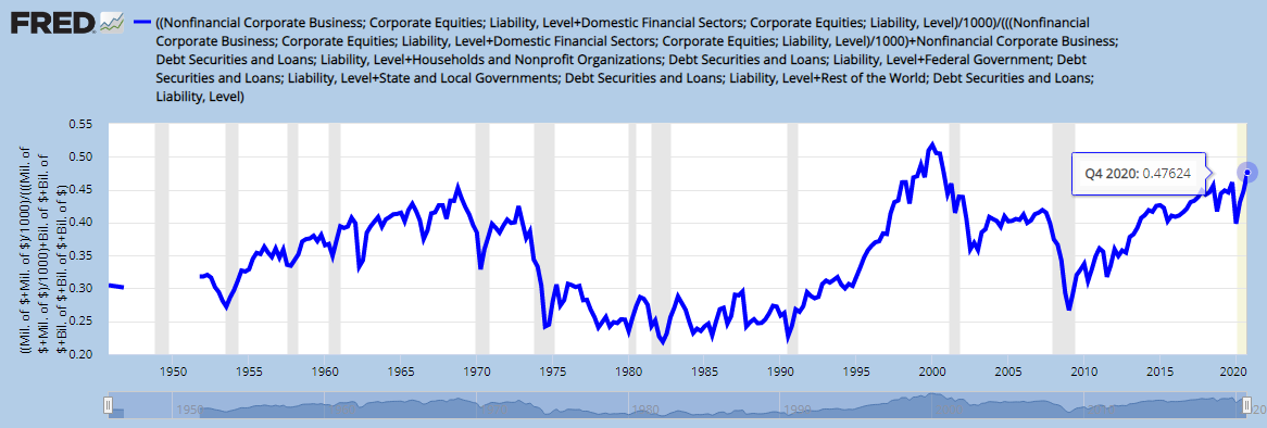 The ratio is calculated here and is 0.476 which is the highest since before 1950 with the exception of the bubble of 1998-2000 where it peaked at 0.518 before popping and retreating to 0.358 four years later. At the low of the 2007-2008 recession it bottomed out at 0.267