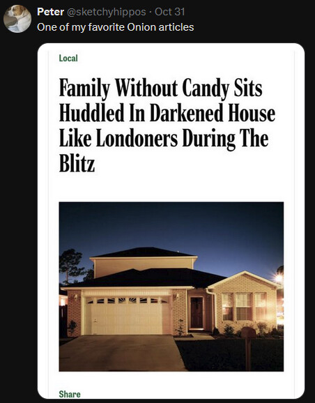 Usually I get no trick-or treaters, the most ever here was I think 3. So, recently, I think it was last year I was not home for the designated trick-or-treat time and did not buy any candy. All well and good except that a little kid came by and knocked on my door on the actual October 31st Halloween. I didn’t like having to tell the kid that I had nothing for him so I will not skip buying candy again.