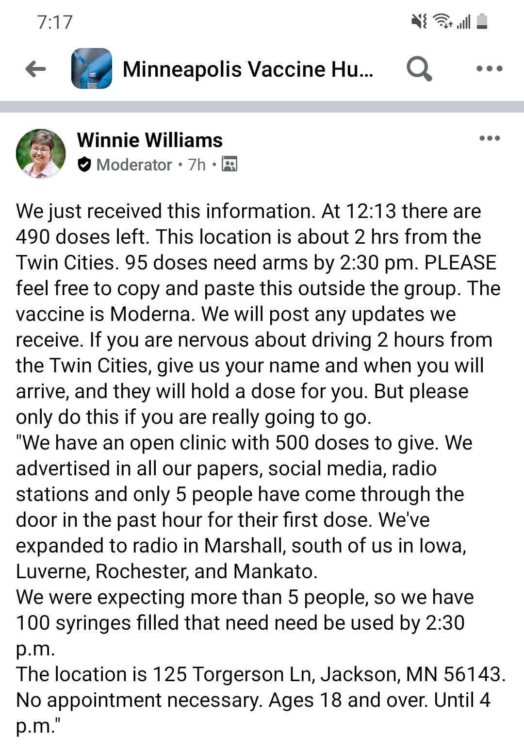 500 dose community clinic in SW MN has 5 people show up, so they panic and call the “Minneapolis Vaccine Hunter” admin trying to get people to go done there.
