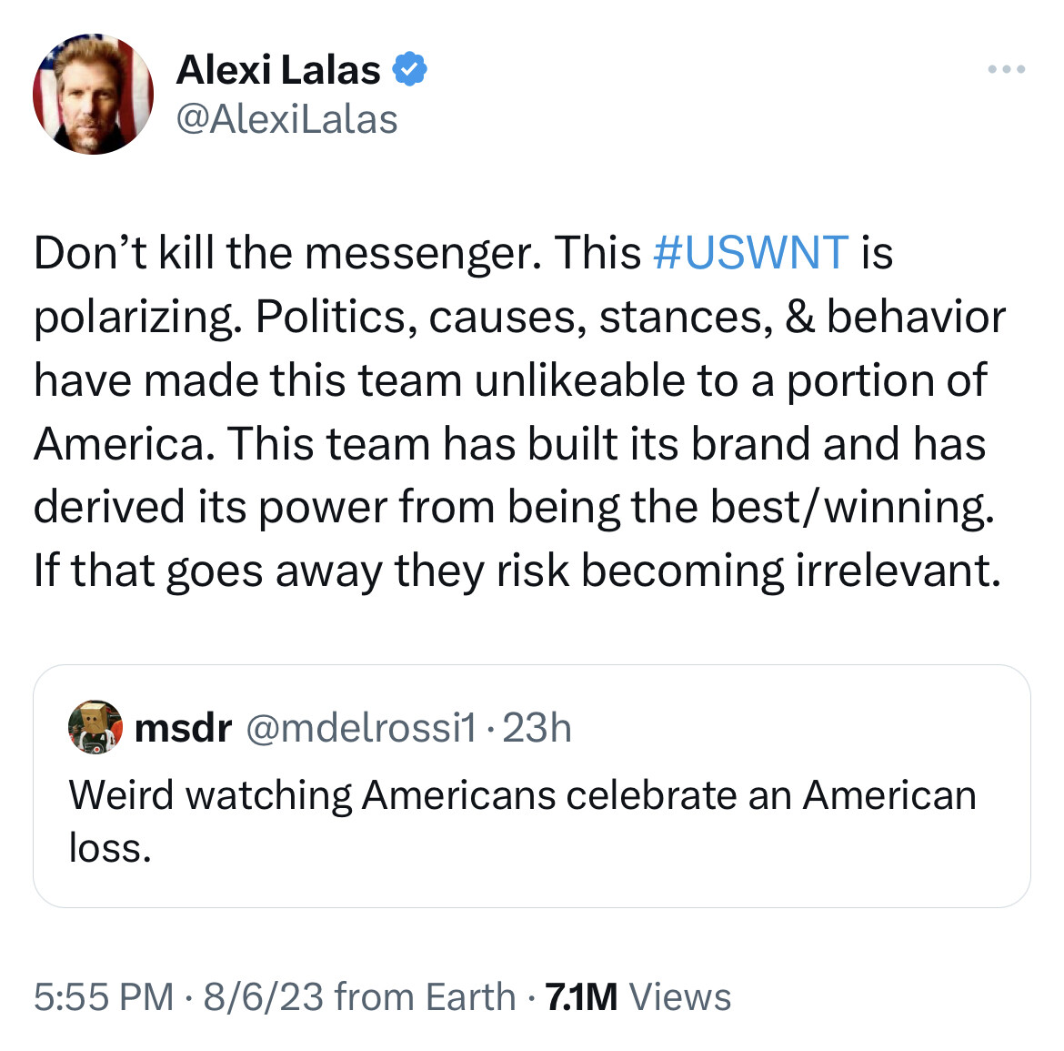 Without any context about Alexi Lalas’ positions, it isn’t clearly gloating. Trump, sure, no argument. You will note that AL doesn’t attribute the loss to taking positions. He is correct that the USWNT will lose the amplification of their message if they fail to win in the long run. A significant number of journalists and even sports commentators/journalists haven’t won a championship. Doesn’t mean their opinions are invalid. And having won doesn’t mean opinions are without challenge.